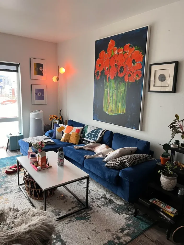 There is a straightforward logic to this living room that makes it immediately satisfying. A large canvas painting of vivid red-orange poppies in a green glass vase against a deep navy background dominates the wall above a royal blue velvet sectional.