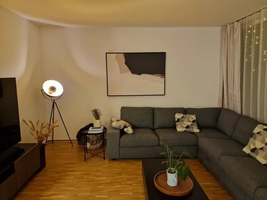 A small plant on the coffee table brings a quiet note of green. The twinkling fairy lights just visible through the sheer curtains on the right contribute warmth without visual noise.