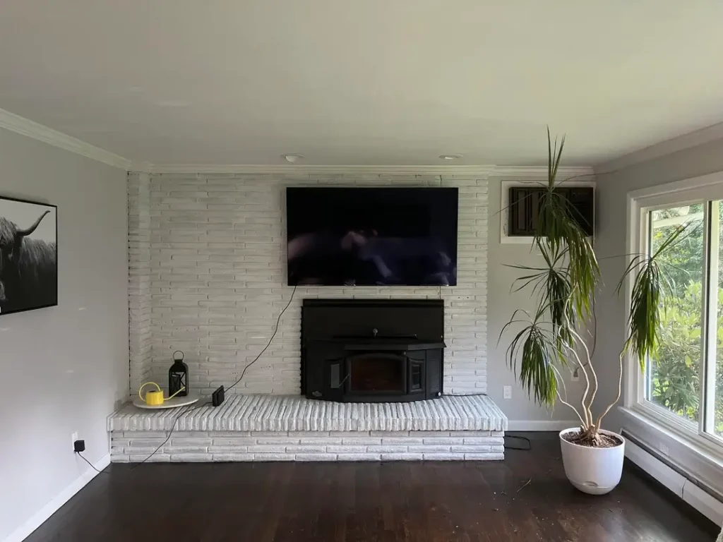 A white-painted brick fireplace wall is already doing structural work as the room’s focal point. The question is what to do with the space around it.