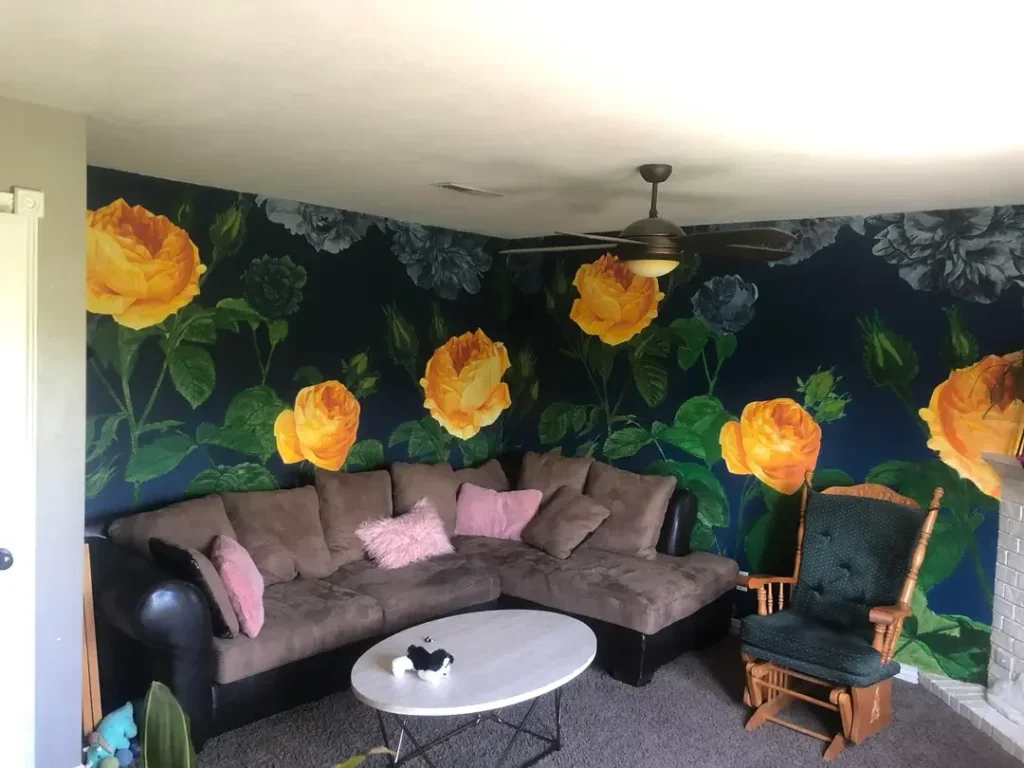 Some wall decor ideas are additions to a room. This one is the room. An oversized floral mural covers every wall surface, depicting giant golden-yellow roses against a deep navy blue background, interspersed with grey peonies. The effect is theatrical, lush, and thoroughly committed.